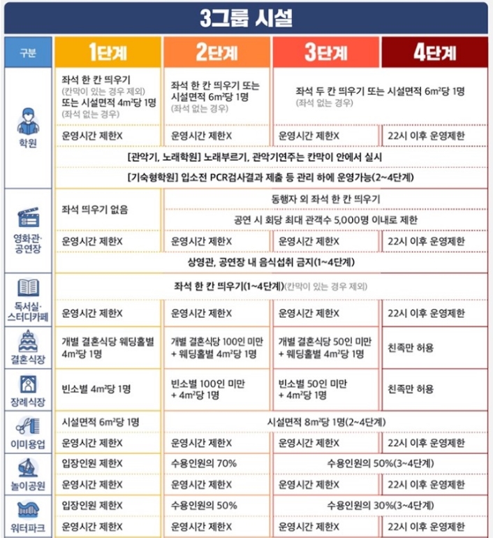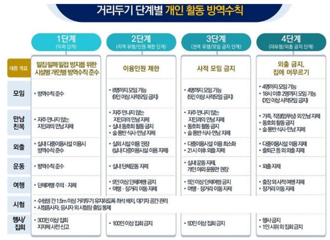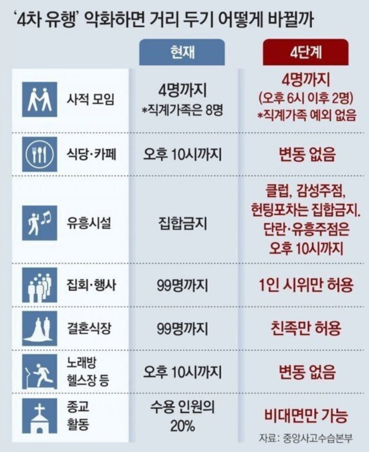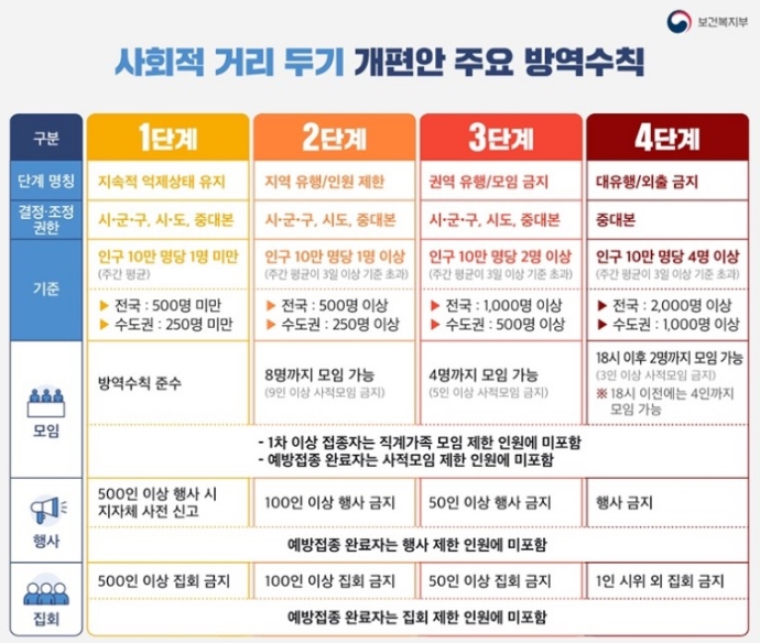 이에 따라 거리 두기 체계상으로 8명까지 모임이 허용되는 2단계, 인원을 제한하지 않는 1단계 지역도 예외 없이 이날부터 4명까지만 사적 모임이 허용.