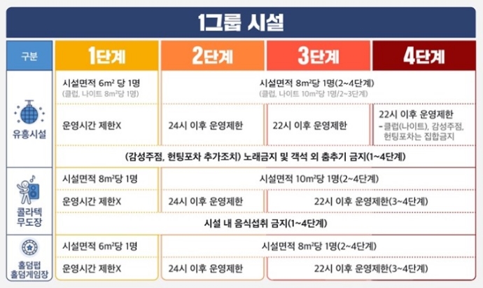 유흥시설은 22시 이후 운영이 제한되며, 클럽이나 감성주점 헌팅포차는 집합금지에 해당됩니다.
