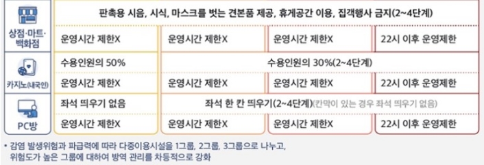 다만 4명까지만 모임을 허용하면서 예외 사항을 제한하는 3단계와 달리, 2단계 수준으로 예외를 인정하고 지방자치단체별로 상황을 고려해 자율적으로 조정.